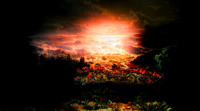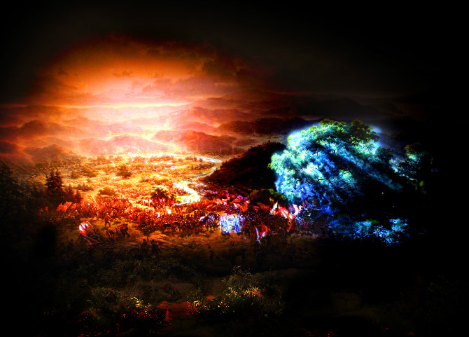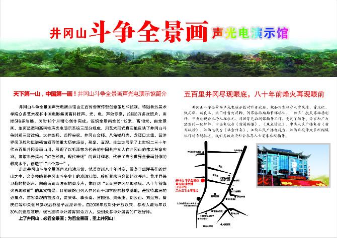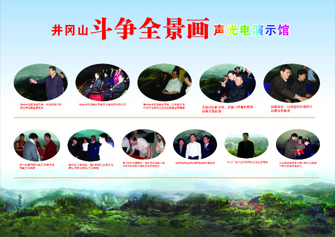 该馆由中共江西省委宣传部创意策划和监制,特邀鲁迅美术学院众多艺术家和中国电影集团高科技声、光、电、声效专家,拍摄3万多张照片,用掉5吨多油墨,历时14个月精心创作完成。该馆全长112米,高18米,由全景画、地面塑型和高科技声光电演示系统三部分组成,艺术真实地反映了井冈山斗争时期重大历史场景,形象、直观、生动地展示了上世纪二三十年代五百里井冈秀丽山川,展现了以毛泽东为代表的共产党人在井冈山的伟大革命实践。走进井冈山斗争全景画声光电演示馆,恍若穿越八十年时空,置身于雄浑苍茫的群山之中,亲身领略着井冈山斗争史上的波澜壮阔,聆听着朱毛会师的欢呼声、黄洋界保卫战的枪炮声、向赣南闽西进军的脚步声。运用声光电效果,使得每一个场景都以一种动态的画面效果呈现出来,使得每一位观众都能体验到“五百里井冈尽现眼底,八十年前烽火再现眼前”的真实情景,给人一种强烈的心灵震憾和视觉冲击。